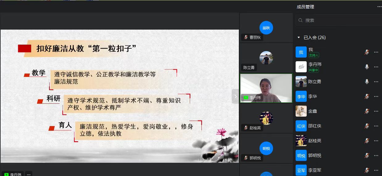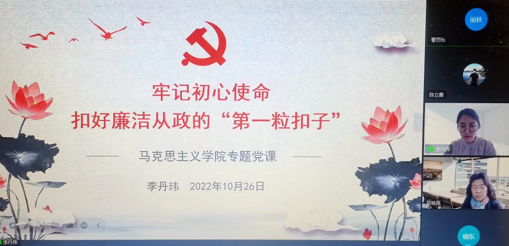 10月26日,下午3点,伟德国际VICTOR1946教师、纪委监督员李丹玮同志在钉钉视频会议中为全院教职工讲了一堂生动的党课。题目为:《牢记初心使命扣好廉洁从政的“第一粒扣子”》。视频会议由曹丽秋同志主持,公司全体教职工聆听了党课。