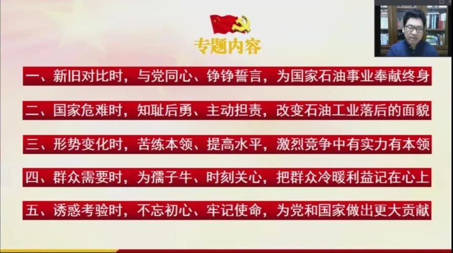 10月8日是“铁人”王进喜诞辰98周年纪念日,为深切缅怀“铁人”,追忆“铁人”的奋斗历程,传承和弘扬“铁人”精神;为科学化培养具有“忠诚的政治品格、浓厚的家国情怀、扎实的理论功底、突出的能力素质”的青年政治骨干,当日下午,公司“青马工程”培训班专题讲座在线上举行。伟德国际VICTOR1946陈立勇副教授作了题为《弘扬铁人精神 传承红色基因》的专题讲座。100名青马工程学员及老员工骨干参加了讲座。