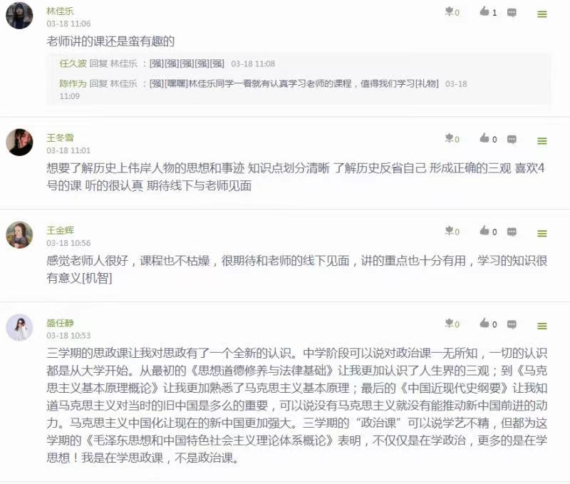 教学过程中员工能够积极思考也是课堂活跃的一个标志,如何能引导员工积极思考,这在很大程度上取决于教师上课过程中互动问题的设计与交流。 邵红侠老师为了提高线上课堂互动性和针对性,对线上教学准备更充分,教学内容更丰富,很好地将教材体系转化为线上教学体系,重点突出在知识点的深度剖析以及相关案例的选取挖掘上下功夫,选取时政热点和员工感兴趣的知识点增加教师与员工之间的有效而深入的教学互动。例如在对社会主义制度确立这个问题的讲解中,以问题为导向、层层递进、步步深入,再提出更多的问题:中国为什么选择了社会主义道路而放弃了资本主义道路?选择这条道路的历史必然性和理论依据体现在哪里?中国共产党是如何探索中国道路的?通过互动讲解,让问题带着员工走,老师由理论讲授者变成知识引导者。随着员工对问题的深入思考,老师有意识地对员工进行思维能力训练,对于课堂讨论的话题以及同学们的发言尽量一一回复,做到有问必答、有求必应,让同学们感受到教学形式虽然变了,老师却不会缺席,老师就在身边。从课后统计来看,同学们表现都非常优秀,他们热情、积极、活泼,都积极主动参与互动活动,也给老师很大的鼓舞与激励。