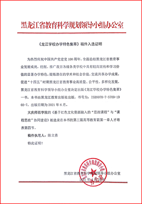 近期,黑龙江省教育科学规划领导小组办公室组织编写的《龙江公司办学育人特色集萃》一书出版。经公司评选推荐、省规划办严格评审,大庆精神研究基地执行主任陈立勇副教授执笔撰写的《基于红色文化资源融入的“思政课程”与“课程思政”协同建设》一文成功入选,被选录为该书第三篇高等教育篇第一章人才培养第四节。