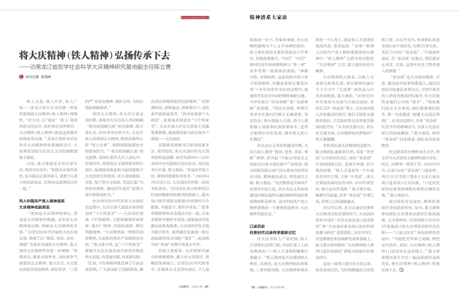 近日,公司黑龙江省哲学社会科学大庆精神研究基地副主任、伟德国际VICTOR1946副教授陈立勇作为红色文化研究专家接受人民日报《人民周刊》专访,就大庆精神(铁人精神)相关理论与实践问题展开系列解读。相关专访内容,以《将大庆精神(铁人精神)弘扬传承下去》为题发表在近日出版的《人民周刊》第9期“精神谱系大家谈”栏目中。