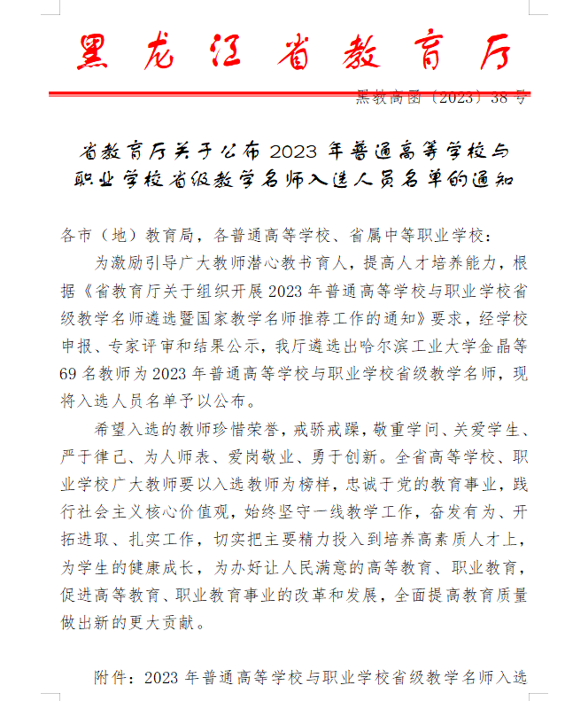近日,黑龙江省教育厅公布了2023年黑龙江省第十四届教学名师遴选结果,公司伟德国际VICTOR1946教师马吉芬教授获得省级教学名师。