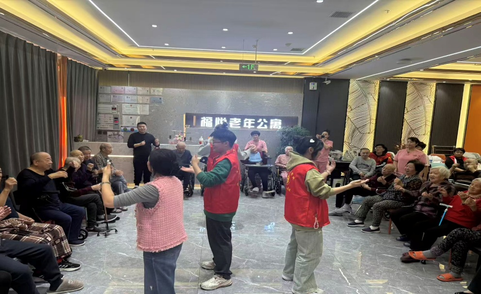 歌曲联唱结束后,志愿者们又带着老人们开展手势舞、手势操互动。考虑到老人的身体机能,志愿者特意挑选了动作简单、节奏舒缓的曲目《桃花朵朵开》《红星闪闪》,从基础的手部摆动到简单的肢体配合,每一个动作都耐心拆解、反复示范。遇到动作生疏的老人,志愿者便俯身靠近,手把手指导纠正,还不时用轻松的话语鼓励老人。老人们兴致盎然地参与其中,跟着志愿者的节奏抬手、摆臂,活动室里欢声笑语不断,银发与青春的身影交织,勾勒出一幅老少同乐的暖心画卷。